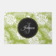 Monogramm Doormat mit einem sich wiederholenden Muster großer Palmen Blätter auf einem olivgrünem Hintergrund. Moderne und tropische Atmosphäre. Ein schwarzer Kreis mit goldfarbenem Innenrand überlagert mit personalisierten Details innen.