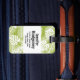 Personalisierter Gepäckanhänger mit einem sich wiederholenden Muster großer Blätter aus Palmen auf einem Olivenhain. Moderne und tropische Atmosphäre. Ein schwarzer Kreis mit goldenem Innenrand überlagert mit den personalisierten Details innen und hinten.