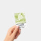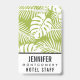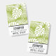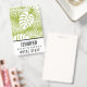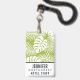 Namensschild mit einem sich wiederholenden Muster großer Palmen Blätter auf einem Olivenhain. Moderne und tropische Atmosphäre. Weiße Fläche unten, um Ihren Namen und Titel zu setzen.