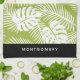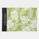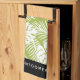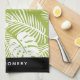 Ein Küchentuch personalisiert mit einem Namen. Das Design besteht aus einem sich wiederholenden Muster großer Blätter aus Palmen auf einem Olivenhain. Moderne und tropische Atmosphäre.