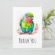Vielen Dank Karte mit einer niedlichen Papagezeige. Ein kleiner grüner Papagei mit blauen und gelben Farbtönen, der sich harmonisch zusammenfügt. Neck hat einen lebendigen Schatten von rötlichem Rosa.