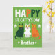 Designed with a lime green background, this St. Patrick’s Day card sets a festive scene with scattered white shamrocks and a cozy, friendly mood 💚. Near the top center, the text reads “HAPPY ST. CATTY’S DAY Brother,” stacked in a mix of white, deep emerald, and warm orange so the words stand out clearly. Below the message, three stylized cats sit close together like pals leaning in for a photo ☘️. On the left, a dark green cat with bright yellow eyes and a small pink smile looks calmly toward the group. On the right, an orange tabby with a striped tail mirrors that gentle, welcoming look, as if returning the same quiet affection. Between them, a white cat dotted with green polka dots opens its mouth in a happy meow, tying the trio together with a lively center point. The cats are drawn with simple, smooth outlines, and the yellow eyes pop against the flat green field while tiny shamrocks float around them.