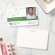 Horizontales Mitarbeiter-ID-Abzeichen personalisiert mit Logo, Foto, Name und Titel, Abzeichen-Nummer und Ablaufdatum. Fügen Sie Namen und Titel in Weiß auf Grün hinzu.