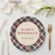 Add a personal touch to your festive gatherings with these custom holiday paper plates, featuring a traditional red and green plaid border and a cheerful "Happy Holidays" message with your family name centered in a classic serif font.