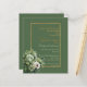 Eine BUDGET Hochzeitseinladung auf einem Blatt Papier mit einem hübschen Blumenstrauß mit grünen Rose, weißem Blumenmotiv und Goldrahmen.