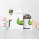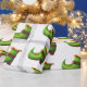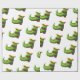 Weißes Umhüllungspapier mit einem Muster von grünen und gelben Koboldstiefeln. Illustriert von Patricia Alvarez.
