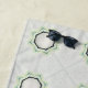Ein ruhiges Design, in dem die überlagerten, sanft grünen Blüten in voller Blüte dargestellt werden. Diese zarten Blumen sind ein wunderschönes Set vor einem knackigen Hintergrund geometrischer Muster in Weiß und Weich Grau und schaffen eine harmonische und friedliche Komposition.