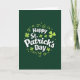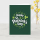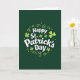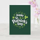 This design shows “Happy St. Patrick’s Day” centered in rounded white lettering with a soft shadow that helps it stand out against a deep emerald green background. The words sit like a cheerful toast between friends, with the gentle curve of each letter giving the line a welcoming, close-together feel 💚. Around the message, lighter apple-green shamrocks are scattered in a loose ring, as if they’re drifting in to frame the greeting. A single three-leaf clover sits to the right side, drawing the eye like a small lucky charm tucked beside the main line ☘️. Thin lime-green curls sweep through the space in looping trails, adding motion that feels like laughter carried on the air. Small round dots in the same lime tone appear here and there, like tiny confetti hovering near the text. The background stays a rich, solid green while the shamrocks, curls, and dots in lighter greens create a layered look around the centered white phrase. The right-side clover is apple green, and the surrounding lime-green curls and dots arc around the central white text on the emerald field.