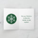 Die Vorderseite hat eine weiße Schneeflocke auf einem dunkelgrünen Hintergrund mit "Frohe Weihnachten" von der Familie um sie herum. Die Innenseite hat eine Wiederholung der Schneeflocke und eine Nachricht in passendem Grün.