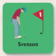 Quadrat grüner personalisierter Golfer, mit einer Kappe, tiefrotes Shirt und blaue Hosen, die einen Golfball in einen Kunststoff-Untersetzer stecken.