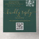 Alles in einer Hochzeitseinladung mit hübschen Saitenlichtern, Mauerkirschen, prächtigen Stilbezeichnungen und schicken Goldtypografien auf smaragdgrünem Hintergrund. Die Einladung enthält eine perforierte RSVP-Karte mit QR-Code. Entwickelt von Thisisnotme©
