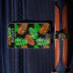 Die tropische Palmenblattkonstruktion ist grün und orange. Personalisieren Sie das Programm mit einem Namen auf der Vorderseite und einem Namen und einer Adresse auf der Rückseite.