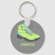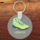 Dieser Schlüsselanhänger zeigt einen Wanderstiefel in kalk-grün und aqua-blau Set vor grauem Hintergrund und ist bereit, mit einem Namen unten personalisiert zu werden, der zu einer grünen Schrift passt.