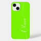 Green White Elegant Calligraphy Script Custom Personalisiert Name iPhone 14 Smart Phone Cases zeichnen sich durch ein modernes und trendiges, einfaches und stilvolles Design aus, mit Ihrem personalisierten Namen in eleganter handgeschriebener Schrift Typografie auf grünem Hintergrund. Entworfen von ©Evco Studio www.zazzle.com/store/evcostudio