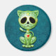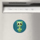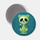 Dieses hübsche, grüne Kätzchen-Design ist mit Wirbel und Punktmustern geschmückt. Gelbe Blume-Pedale umkreisen die reinen schwarzen Augen in der Tradition des Tages der toten Zuckerschädel. Die Katze sitzt da unten und sieht nach vorn, wie ihr Schwanz im Hintergrund windet. Der übergroße Kopf sitzt auf einem winzigen Körper, der ein spielerisches, Cartoon-ähnliches Aussehen schafft. Ein Fünf-Punkte-Stern sitzt in der Mitte der Stirn des Kätzchens, während in der Mitte der Brust ein leuchtend rotes und gelbes Herz auftaucht. Ein Schatten fällt auf den tiefblauen Hintergrund, wodurch das Design gerade über der Oberfläche dieses Magneten zu schweben scheint. Diese niedliche kleine Katze ist ein lustiges und stilvolles Design, inspiriert durch die wunderschönen Muster des Tages der toten Zuckerschädel.