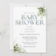 Eine elegante Babydusche mit eleganter, staubblauer Typografie und hübschem botanischem Grün und einem besonderen Foto auf der Rückseite. Entwickelt von Thisisnotme©