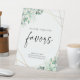 Grüne Eukalyptus Geometrische Gastgeschenke Hochzeiten Pedestal Zeichen. Verfügt über Aquarellfarben Eukalyptus-Blätter und einen goldenen geometrischen Rahmen.