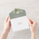 Das Ganze in einer Hochzeitseinladung mit hübschem, grünem Grün und eleganter moderner Typografie auf einem schlauen grünen Hintergrund. Die Einladung enthält eine perforierte RSVP-Karte, die für Sie individuell adressiert oder links als leere Karte für die Handschrift der Adressdaten Ihres Gastes verwendet werden kann. Entwickelt von Thisisnotme©
