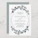 Diese trendige und elegante Hochzeitseinladung besticht durch eine silberne geometrische Form, umgeben von schönen grünen Zweigen.