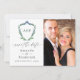 Leafy Wappen mit Monogramm Hochzeit speichern Sie die Dattelkarten mit eleganter Handschrift Typografie, die mit den Initialen des Paares anpassbar.