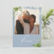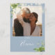 Diese eleganten botanischen grünen Blumenstrauß-Lichter Hochzeitslippen können mit Ihrem Foto und Ihren Tischnummern in schicker Typografie auf einem staubblauen Hintergrund personalisiert werden. Die Karten werden auf der Vorder- und Rückseite gedruckt (doppelseitig). Entwickelt von Thisisnotme©