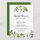 Diese weiße, blumengeschmückte Tee-Party Einladung aus Brautparty ist perfekt für einen rustikalen Polterabend. Das Design besticht durch elegante, weiße, Aquarellbäume mit grünem Blattwerk.