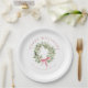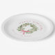 Watercolor Greenery Wreath & Red Coquette Bow Happy Holidays Party Paper Plate. Personalize with your headline and name.