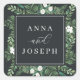 Siegel Sie Ihre Einladungen oder Favoriten mit diesen eleganten botanischen Hochzeitsaufklebern im Winter, die Ihre Namen gerahmt durch einen quadratischen Rahmen von üppigem Wasserfarbenwald in grünen Farbtönen auf einem reichen, farbigen cremefarbenen Hintergrund darstellen. Koordiniert mit unserer Hochzeitskollektion.