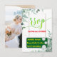 Mit der Greenery Minimalistisch Custom Foto Wedding RSVP Card sorgen Sie für ein nahtloses Hochzeitsplanungserlebnis. Diese elegant gestaltete Karte besticht durch üppige Vegetation und eine moderne minimalistische Touch. Personalisieren Sie es mit Ihren Namen, Hochzeitsdatum und ein maßgeschneidertes Foto, um Ihre Hochzeit perfekt zu gestalten. Die Gäste können einfach reagieren und dabei helfen, Ihre Gästeliste stilvoll zu beenden. Ideal für rustikale, boho und zeitgenössische Hochzeiten, fügt diese RSVP-Karte Ihrer Hochzeitszeitung eine raffinierte und personalisierte Touch hinzu
