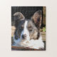 Ein wunderschöner Farb-Hund, der sich hinter einem Traktoranhänger versteckt hat.