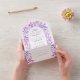 Diese Winterhochzeitseinladung zeigt einen Bogenrahmen aus Beeren und Blätter auf Lavendelhintergrund. Die Vorderseite des Einladungs-Designs zeigt die Namen des Ehepaares in einer lila Lavendelfarbe, zusammen mit den notwendigen Hochzeitsdetails. Zusätzlich enthält die Einladung eine abnehmbare RSVP-Karte für den Gast.