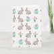 Designed with a repeating spring pattern, this card features stylized long-eared rabbits in soft gray, with blush-pink inner ears and tiny rosy cheeks 🐰. Some pairs face each other with a tender, friendly lean, as if sharing a quiet secret, while others look outward to invite the viewer in. Between them sit clusters of spring flowers, including closed pink blooms touched with yellow and small lavender blossoms that feel gently fresh 🌷. Several of the purple flowers are framed by a faint pale-blue circle, like a soft halo of morning dew. The background stays very light, letting the pastel animals and flowers stand out without feeling busy. Small polka dots in yellow, light blue, and pink are scattered throughout like confetti or new buds. No headline text appears, leaving the pattern to fill the front with rabbits, flowers, and dots evenly spaced across the surface.