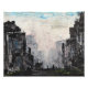A cityscape stands shrouded in mist, with dark, textured buildings rising on either side of a deserted street. The contrast between the stark structures and the obscure background creates a mysterious and somber atmosphere.