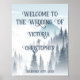 Ein mysteriöser grauer Wald mit einem romantischen, weißen Nebel um die Kiefern und Berge im Hintergrund ist ein großer wilder Empfang zu unserem Hochzeitsposter. Die Typografie enthält alle Kappen mit einer schönen Signatur, die auf den Buchstaben dieses hübschen Drucks geblüht ist.