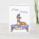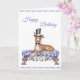 Niedlicher Windhund auf einem lila Sofa mit einem Hut und einem Monokel. Niedliche und lustige Geburtskarte