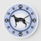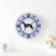Hundebesitzer und Hundefreunde werden dieses moderne Design mit einer Greyhound-Silhouette und Pfotendrucken, die die Zahlen auf der Uhr darstellen, mit einem blauen Hintergrund und einem dunkelblauen Ring genießen.