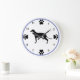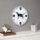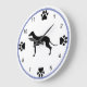 Eine Hundeschlittenuhr mit der Silhouette eines Windhundes, mit Pfotendrucken, die die Viertelstundenzahlen markieren, und einem dünn blauen Rand um den Rand.