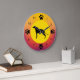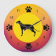 Hundebesitzer und Hundefreunde werden dieses farbenfrohe Design mit einer Greyhound-Silhouette und Pfotendrucken genießen, die die Zahlen auf der Uhr darstellen, mit einem Hintergrund von Orangen-, Gelb- und Rottönen.