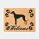 Greyhound Silhouette mit Pfotendruck und "Welcome" Text in schwarz.