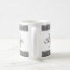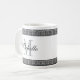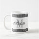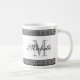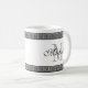 Griechische Schlüsselwindungsmustergrenzkundenspezifische Monogramm-Kaffee-Tasse. Stellen Sie Ihre eigene mit Monogramm Schale mit stilvollem Schwarzweiss-Gitterwerk und nobler Skripttypographie her. Geburtstaggeschenk- oder -hochzeits-Gastgeschenk für Männer, Frauen, Freunde und Familie. Kundenspezifische Getränkwaren für Zuhause, Büro, Arbeit, Restaurant, Schule etc. Auch verfügbar als große übergroße Tassen und groß gehen Reise-Tassen. Machen Sie ein für Braut und Bräutigam, Lehrer, Krankenschwester, Chef, Co-Arbeitskraft, bester Freund, Mamma, Vati, Onkel, Großmutter, Großvater etc.