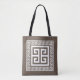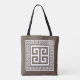Tote Tasche mit griechischem Schlüssel (Meander) Muster elegante weiß-braun Design in goldener Farbe mit Schlüssel Rand zu entsprechen. Dieses Design des berühmten und beliebten griechischen Musters der Fortsetzung Zeile kann bearbeitet werden, um seine Farbe zu ändern, wenn Sie möchten. Sie können auch die Hintergrundfarbe des Designs ändern, indem Sie sie bearbeiten.