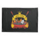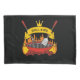 Grillgrill über flammender Holzkohle, Scrollbanner mit individuellem Text über Gabel und Spatel.