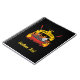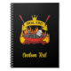 Grillgrill über flammender Holzkohle, Scrollbanner mit individuellem Text über Gabel und Spatel.