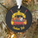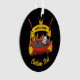 Grillgrill über flammender Holzkohle, Scrollbanner mit individuellem Text über Gabel und Spatel. Benutzerdefinierte Hintergrundfarbe. Benutzerdefinierter Text auf beiden Seiten.