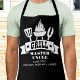 Einzigartige schwarze Schürze für einen beliebten Onkel zu Weihnachten, zum Vatertag oder zu seinem Geburtstag mit Illustrationen eines Grillgrillgrills und "Grill Meister Onkel" in lustiger weißer Typografie. Fügen Sie die Namen seiner Nichten und Neffen hinzu. Falls erforderlich, bearbeiten Sie das Entwurfstool, um die Größe des Schriftartes für eine längere oder kürzere Liste von Kindernamen zu erhöhen oder zu verringern.
