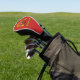 Grillgrill über flammender Holzkohle, Scrollbanner mit eigenem Text über gekreuzte Zungen und Pinsel. Benutzerdefinierte Hintergrundfarbe. Benutzerdefinierter Untertext.