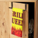 Grill Queen lustiges Grillen Sprichwort in einem Western flammendem Schriftart für Köche und kochen Koch. Mit Grafik von roten und orangefarbenen Flammen auf einem gelben Handtuch.