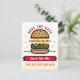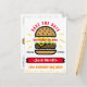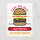 Mit dieser für alle Altersgruppen passenden Postkarte, die eine moderne Grafik eines Burgers mit Flammen in Rot, Orange, Braun und Schwarz auf weißem Hintergrund mit farbenfroher Typografie in fett gedruckten Schriftart enthält, kündigen Sie Ihre Geburtstagsparty der GRILLEN an. Personalisieren Sie es mit allen Details, die Sie brauchen, um Ihre Gäste einzuladen, einschließlich Name, Alter, Tag, Datum und Anlass auf dem Cover und zusätzliche Informationen mit den Adressen und UAWG auf der Rückseite. Entworfen von © Tim Coffey.