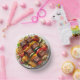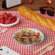Ein nahes Aufgebot an gegrillten Fleisch- und Gemüseskecheln, die auf einem weißen Teller kunstvoll angeordnet sind. In den Spießen finden Sie köstliche Fleischsorten mit lebhaften Glockengebäck, Zwiebeln, Zucchini und saftigen Kirschtomaten, die alle durch eine leichte Glasur glänzen. Der Teller ist mit Kräutern und Gewürzen bestäubt, was auf die köstlichen Aromen im Inneren hinweist.