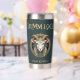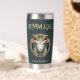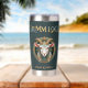 Keep your drinks at the perfect temperature with this Grimmloch insulated tumbler, featuring the official emblem of the narrative-based RPG by Opulent Code LLC. The detailed horned goat crest, paired with rich teal and gold tones and full Grimmloch branding, creates a bold and polished design that stands out beautifully.